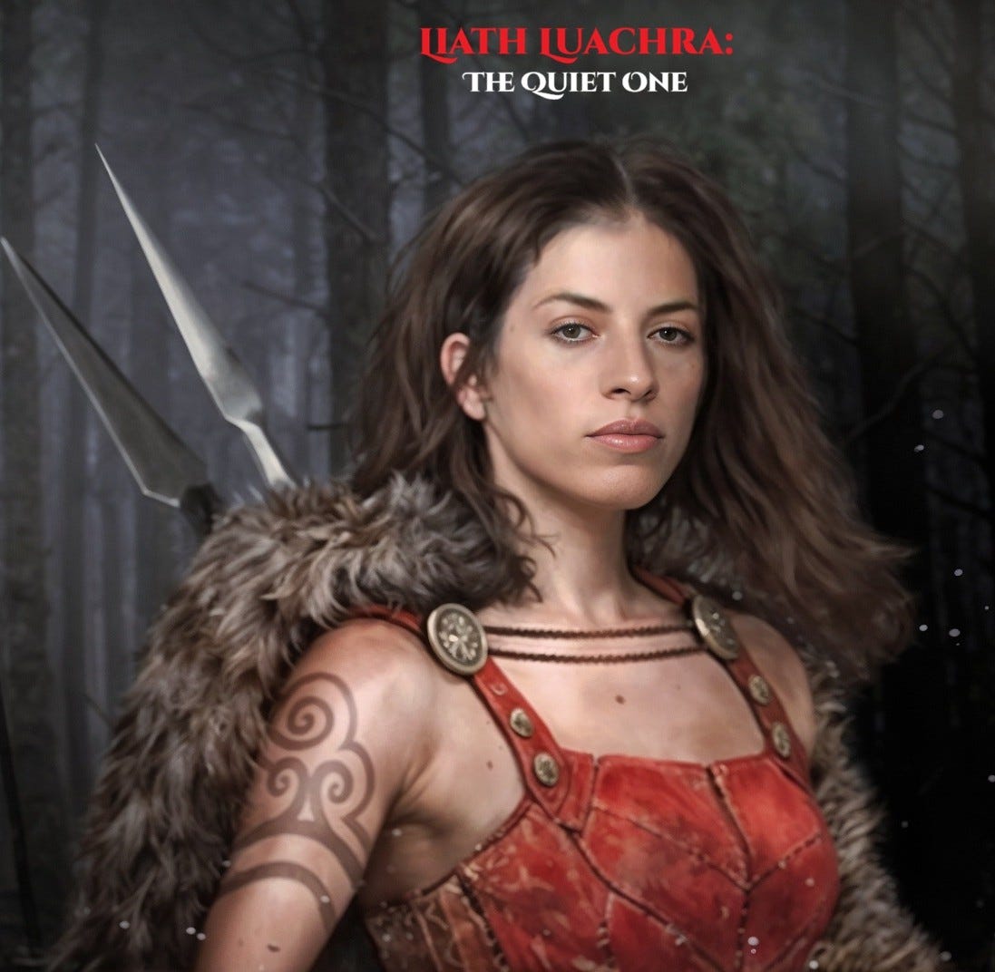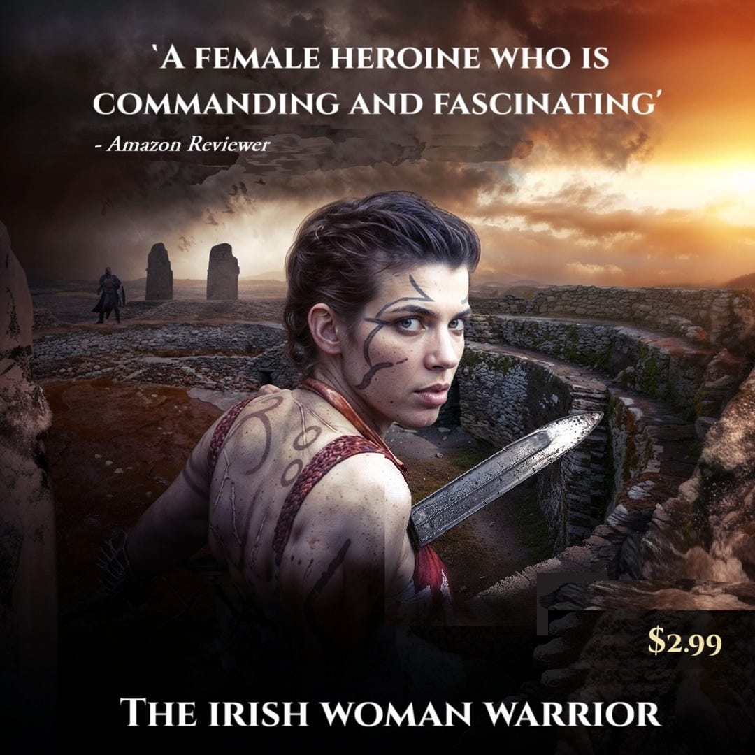 Obviously, a very different look to the character in the ‘FIONN mac Cumhaill Series’, or even the ‘Irish Woman Warrior Series’. I cover the development of Liath Luachra’s character for this book some more in the paid section of the newsletter (under the article ‘Black Phoenix’).